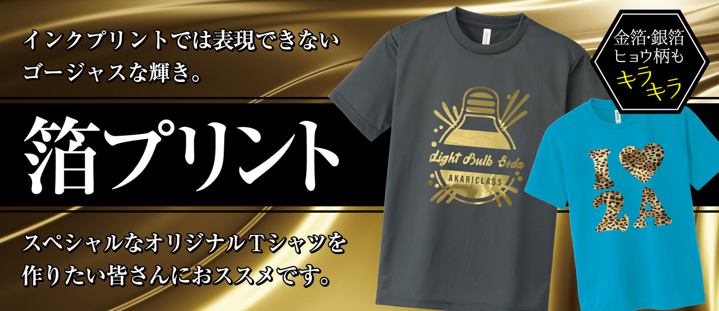 金箔や銀箔はもちろん、ヒョウ柄や、カモフラ柄もご用意しています。自分達のオリジナルデザインが、ゴージャスに輝く箔プリントで、特別なクラスTシャツを作ろう!
