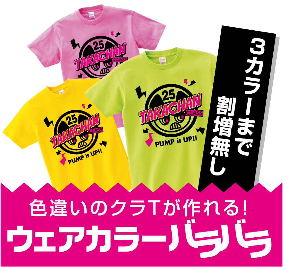 ※20枚以上のご注文で、デザインが共通ならウェアカラーが3カラーまで割増無しで作れます。4カラー目からは1カラー追加毎に+150円(合計金額に)です。