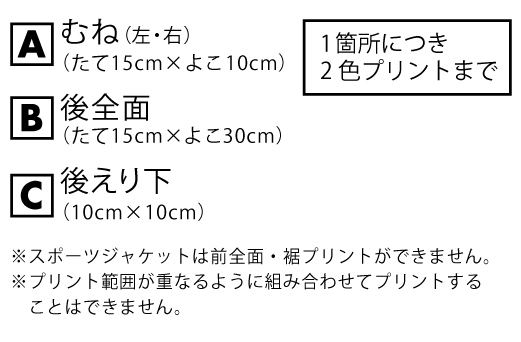 ※プリント場所を増やしたり色数を増やす場合は1箇所1色増えるごとに上記追加料金をたしてください。