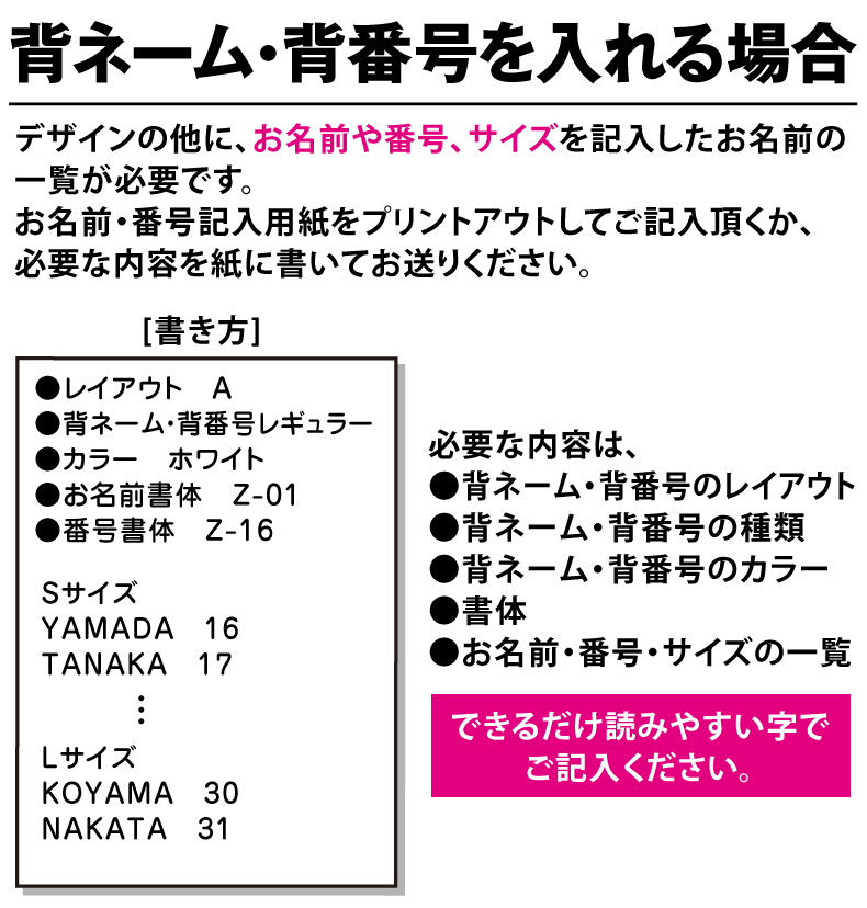 WEBでご注文! WEBからご注文する場合は、以下のご注文フォームに必要事項をご入力頂いて送信してください。デザインはフォームに添付するか、フォーム送信後にメールかLINEでお送りください。 ※よりスムーズなご対応をする為に、弊社が運営している「ハリーズマーケット」のLINEと統一致しました。価格・サービス等に変更はありませんので、こちらのLINEアカウントでお問い合わせ・ご注文をお願い致します。 →[お名前・番号記入用紙ダウンロード]← お名前の一覧はメールやLINEで直接文字を入力して頂いてもOKです。上の絵のようにサイズ毎にまとめてご入力ください。