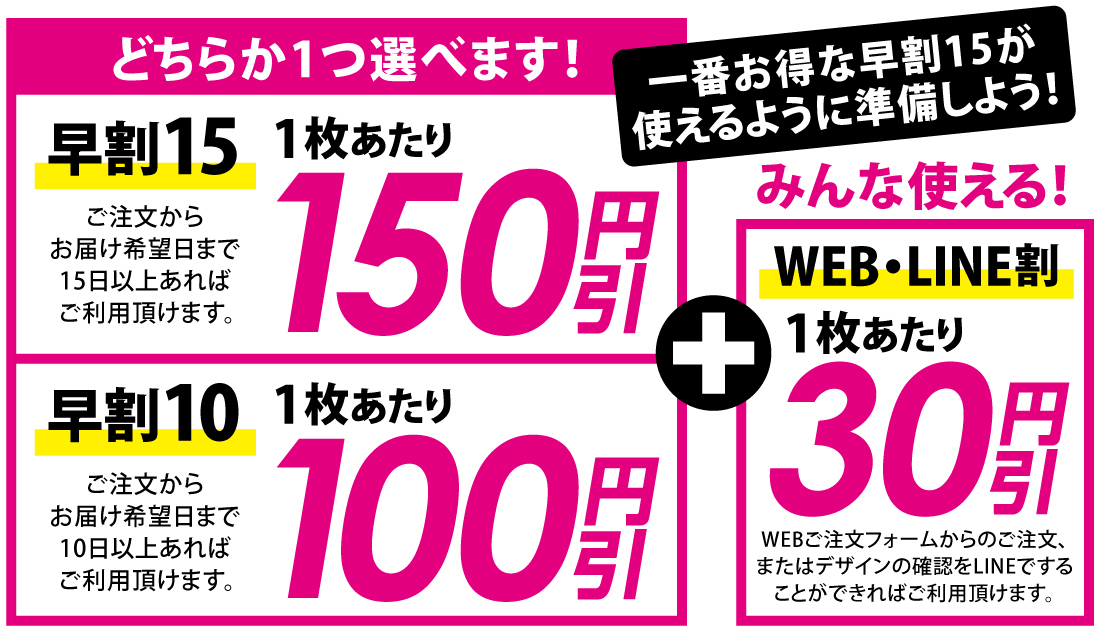※ご注文から1週間以内のお届け・無地販売は割引が使えません。また、年末年始・その他連休は日数のカウント外です。デザイン確定後にお客様理由によるデザインの大幅変更や、枚数変更がある場合は割引が無効になります。